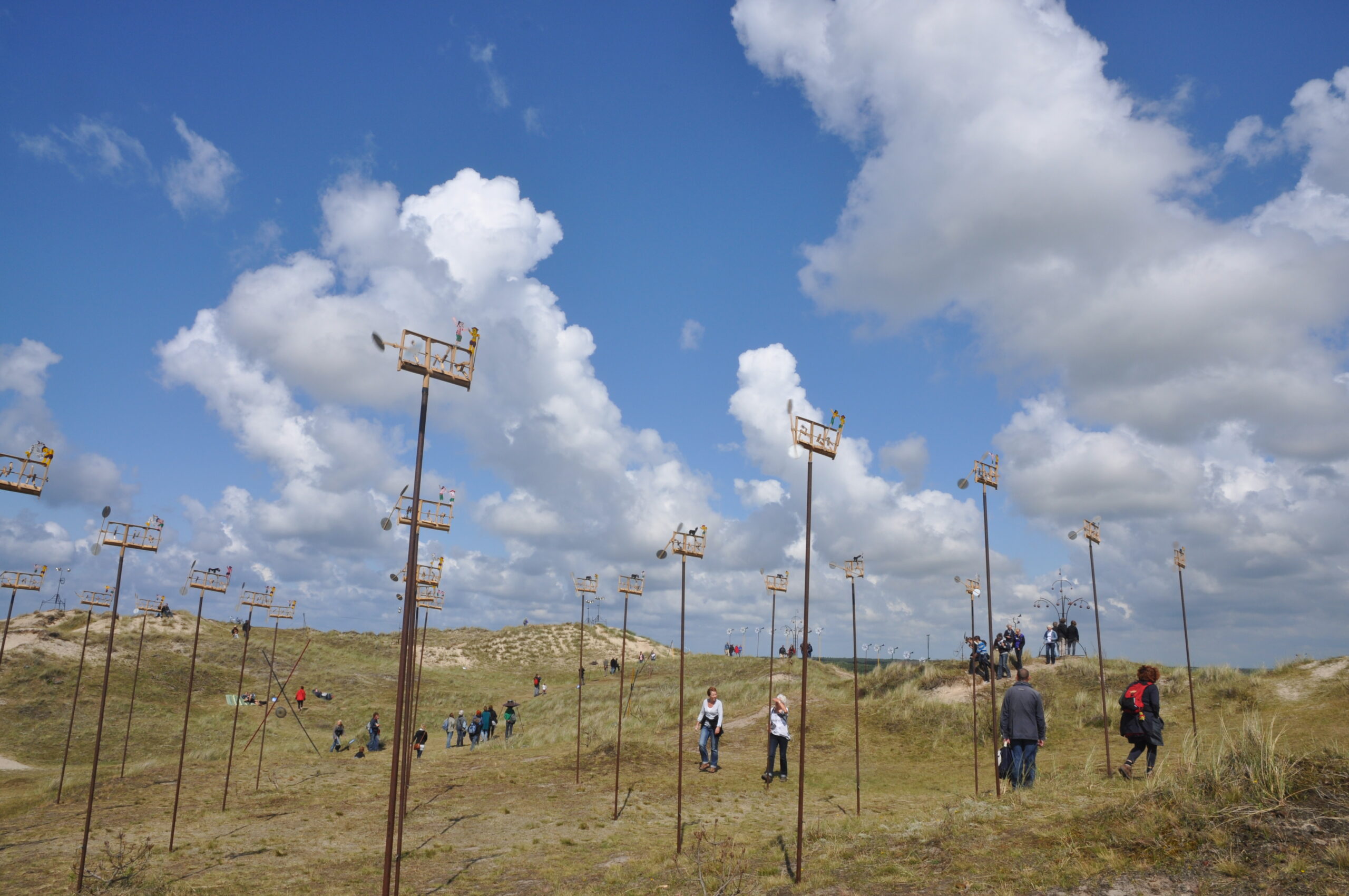 De wind werd componist in Harmonic Fields (2011): een landschap vol instrumenten – cello’s, drums, bamboefluiten, klokkenspelmolens en draaiende muziekdoosjes – van gezelschap Lieux Publics & Cie onder leiding van Pierre Sauvageot. Zonder elektra of computers gaf de installatie volledig gehoor aan het Oerol-thema van dat jaar: het geluid van het eiland.